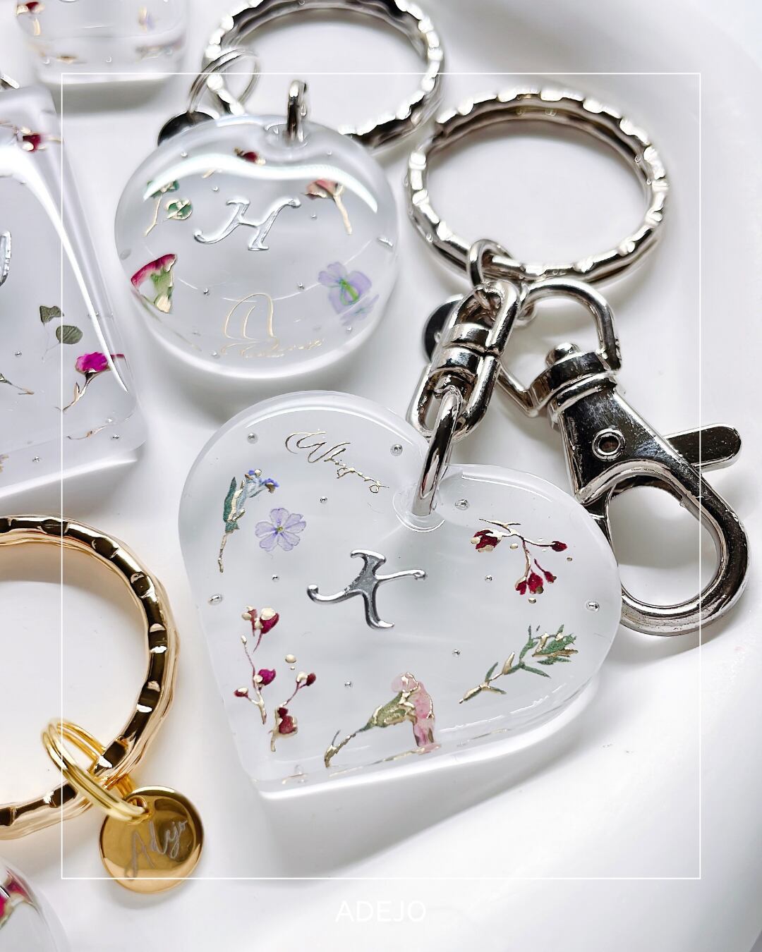 こちらのキーホルダーは、ハートの中に小さな植物を美しく散りばめたチャームです。優しくて上品な印象の薄いホワイトの背景。透け感が可愛らしさを引き立てます。ゴールドとシルバーの2色展開で、お好きなカラーをお選びいただけます。