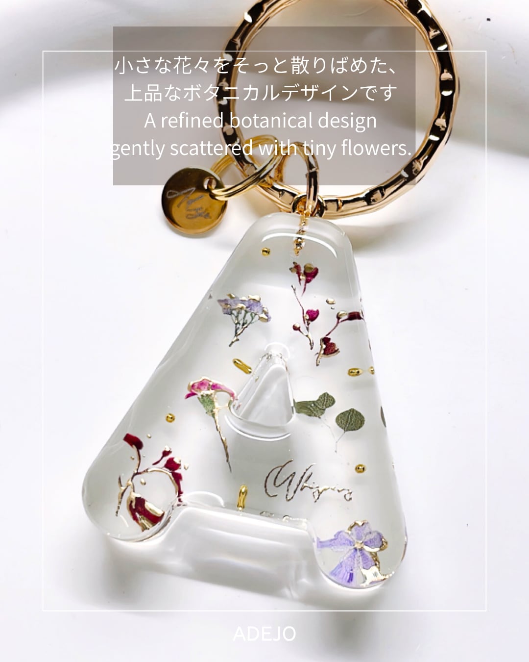 植物や小花を散りばめた美しいデザインのボタニカルチャーム。アルファベットのフォントにデザインが施されており、透明感あふれる水々しい印象を与えます。おしゃれでかわいらしい佇まいは、日常のアイテムとしても心を弾ませる存在です。