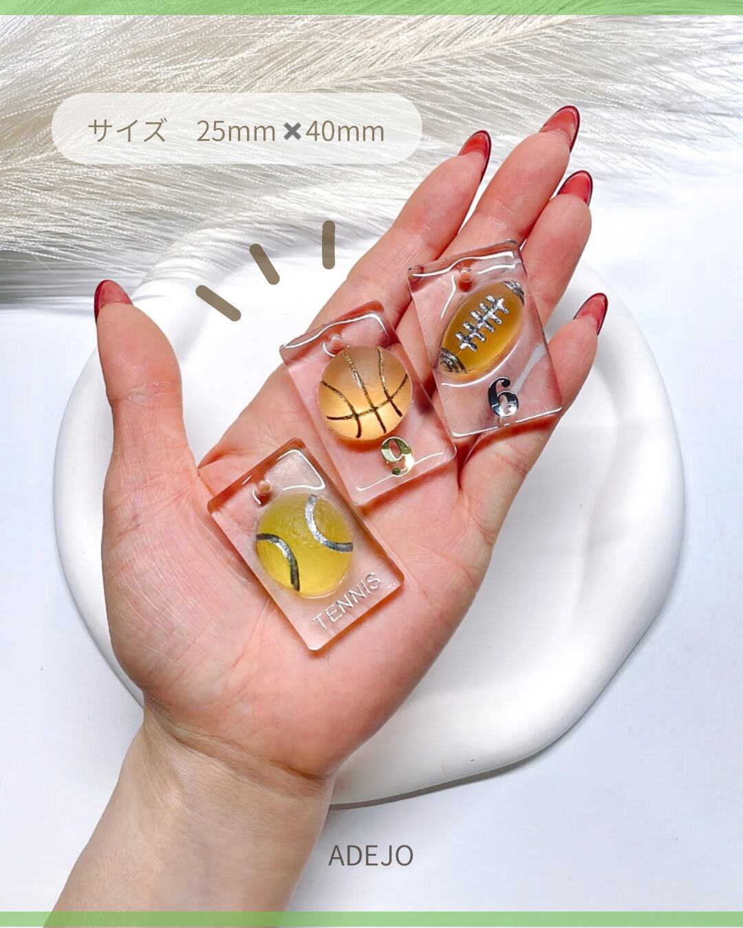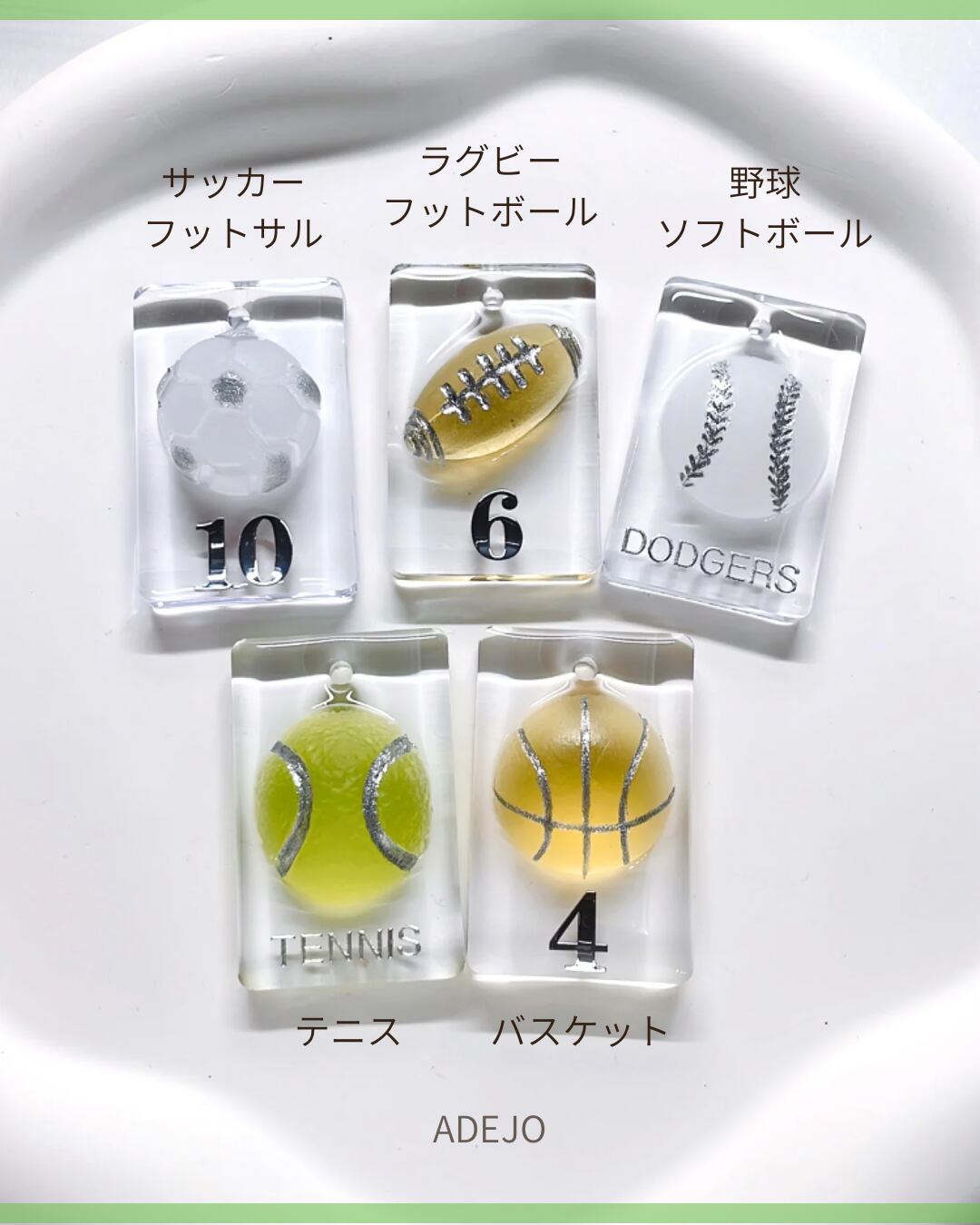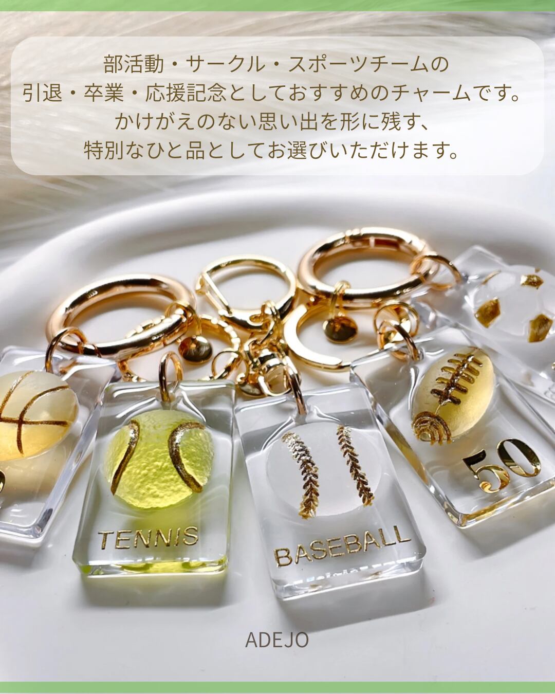 ■思い出を形にするスポーツチャーム! 透明感のある華やかなデザインが目を引く、スポーツチャームの登場です。名前や背番号、チーム名などを自由に文字入れできるので、あなただけの特別なアイテムとして、大切な仲間との思い出をいつでもそばに感じられます。