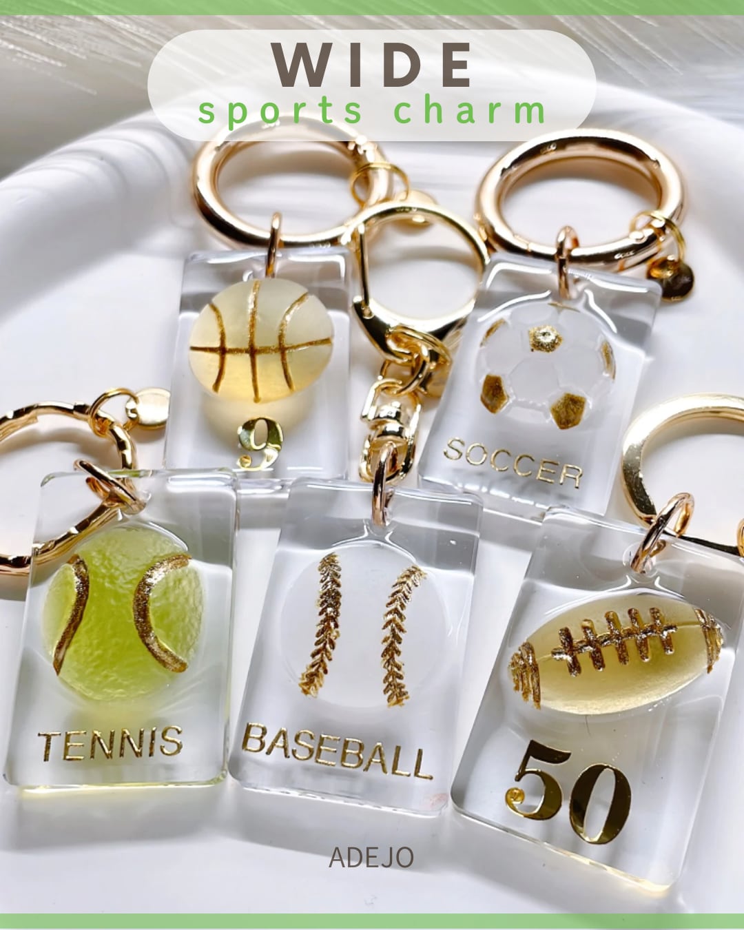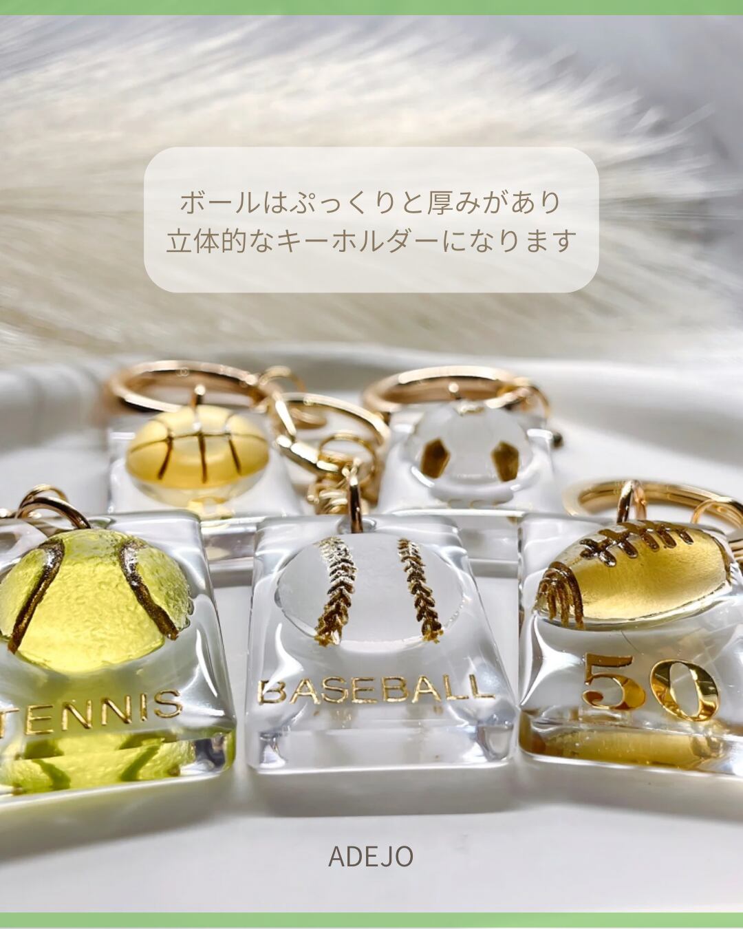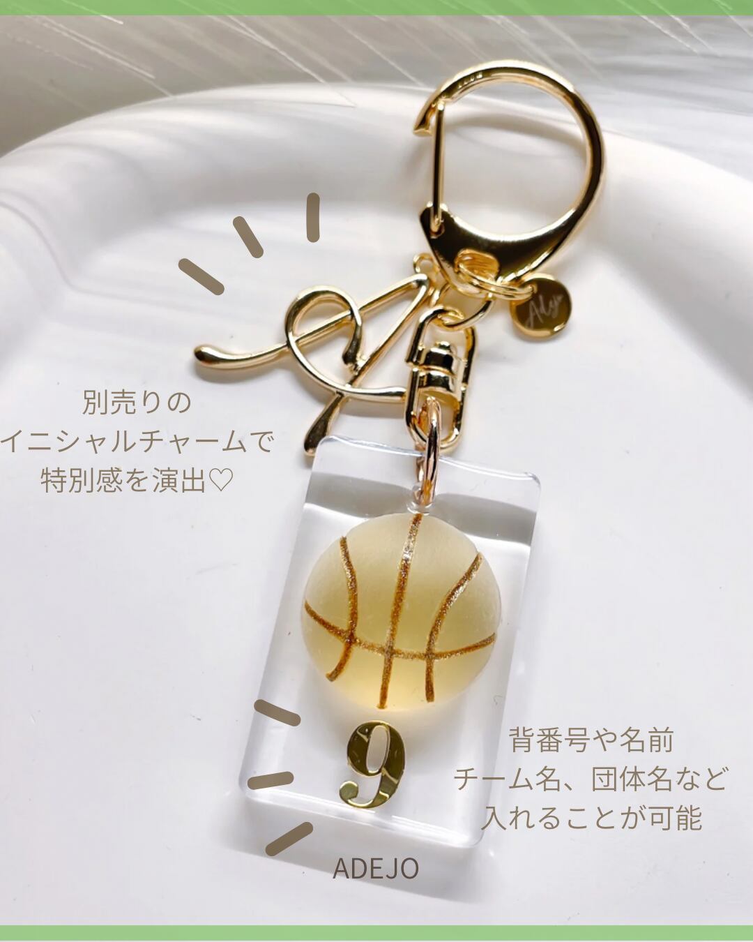 ■思い出を形にするスポーツチャーム! 透明感のある華やかなデザインが目を引く、スポーツチャームの登場です。名前や背番号、チーム名などを自由に文字入れできるので、あなただけの特別なアイテムとして、大切な仲間との思い出をいつでもそばに感じられます。