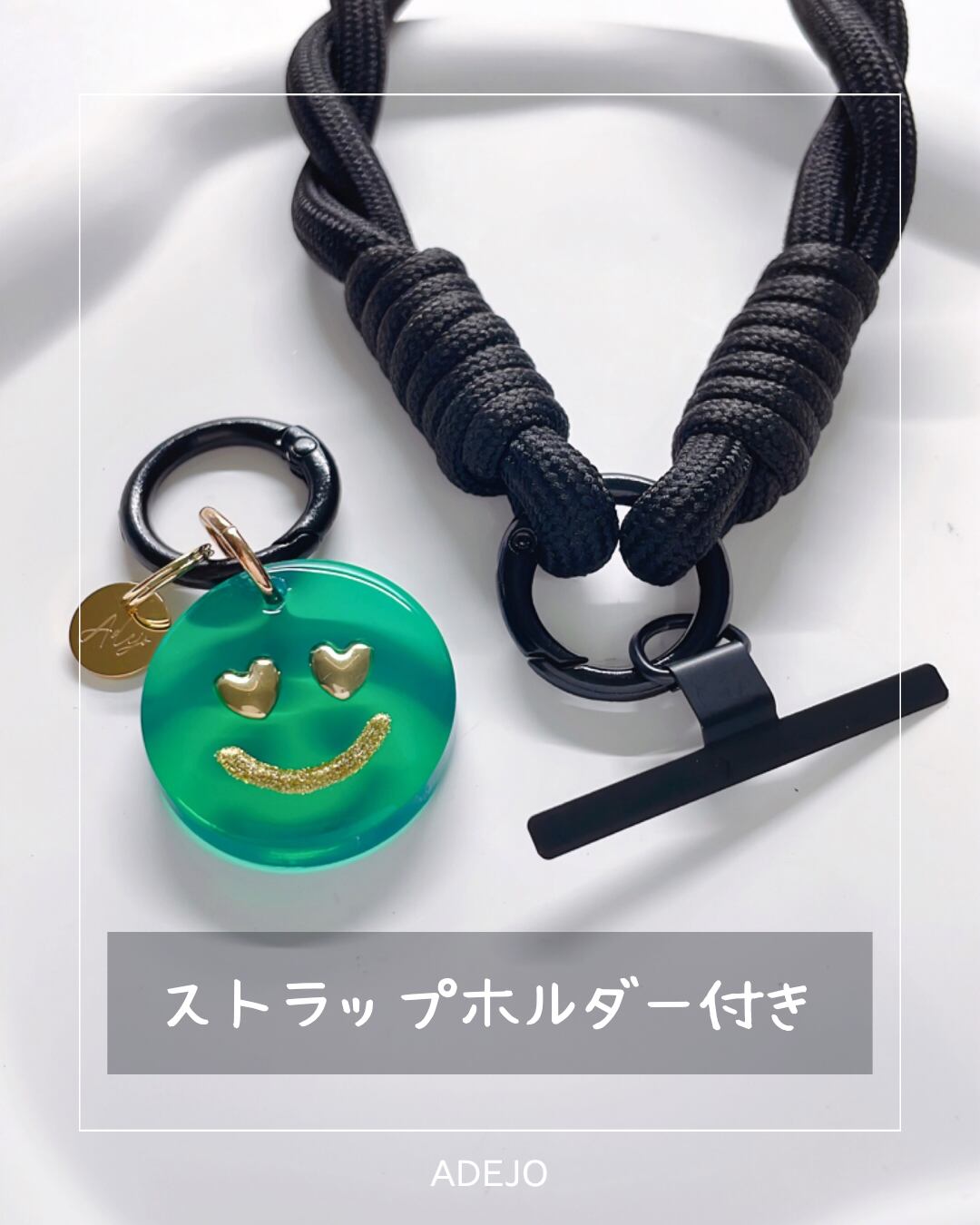 洗練された黒のストラップに、ポップなチャームがアクセントとなったスマホストラップが登場しました!紐の長さは全長約28センチで、スマホやカバン、鍵などに簡単に取り付けて使える便利アイテムです。カラビナが2つ付属しており、自由にカスタマイズすることで、あなたのオリジナリティを引き出せます。手首に引っ掛けての外出にもぴったりで、使い勝手も抜群です。