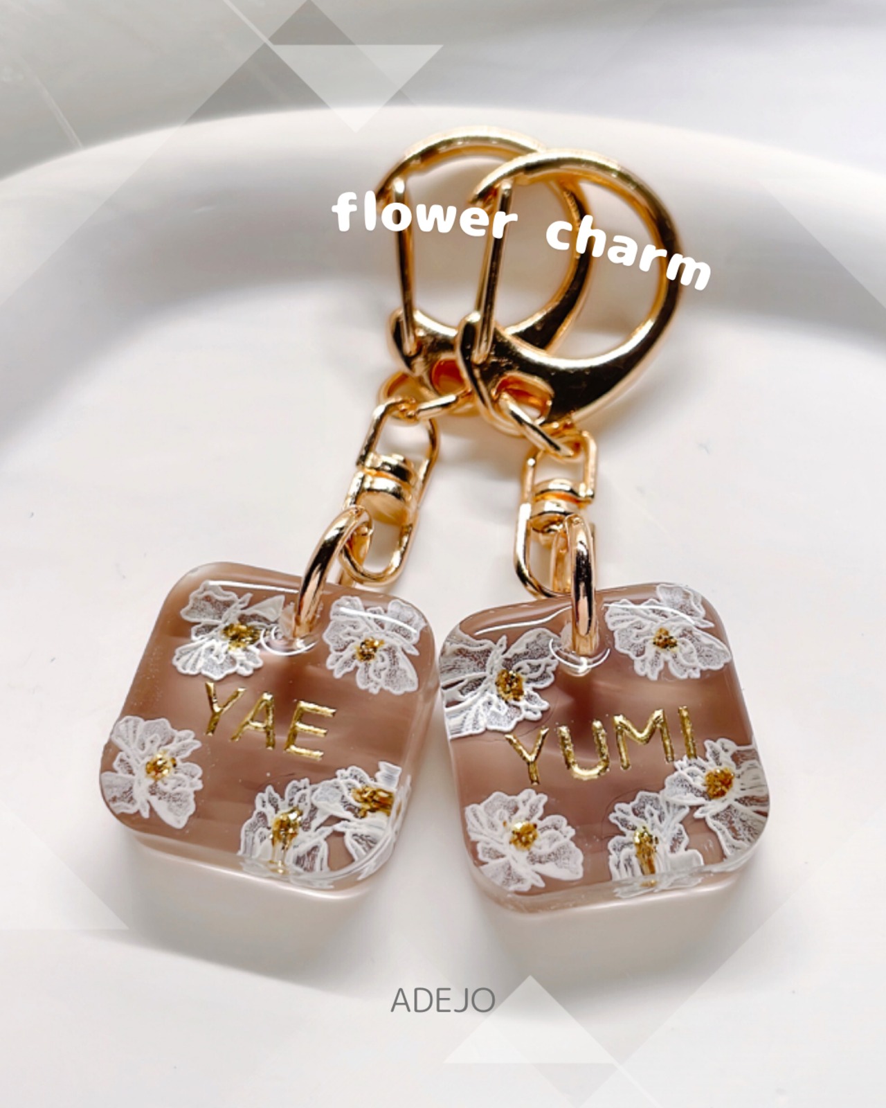 お花を散りばめた上品でエレガントなキーホルダーです。コロンとしたスクエア型が華やかで可愛らしい印象を与え、女性らしさを引き立てます。大切な方へのプレゼントやお礼にぴったりのアイテムです。