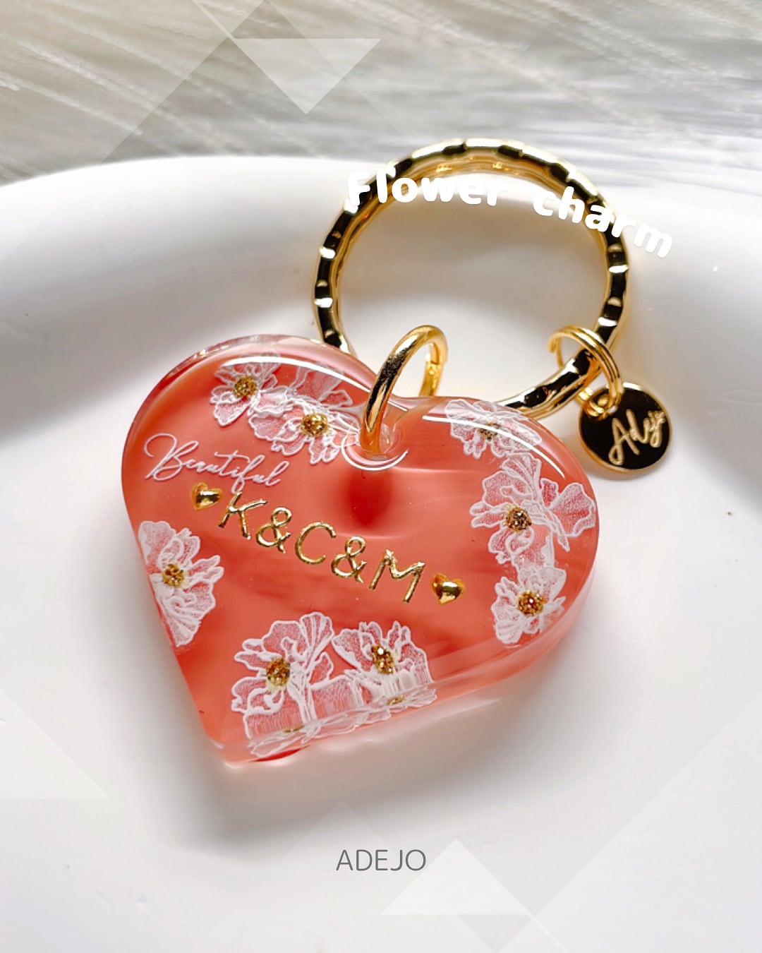 ラブリーな印象のフラワーチャームが登場しました! かわいらしいハートチャームの乙女な雰囲気漂うキーホルダーです。優しいイメージをお届けするため、背景のカラーバリエーションも豊富。大切な人への贈り物やプレゼントにも最適です。お祝いの日に嬉しい驚きを演出しませんか?