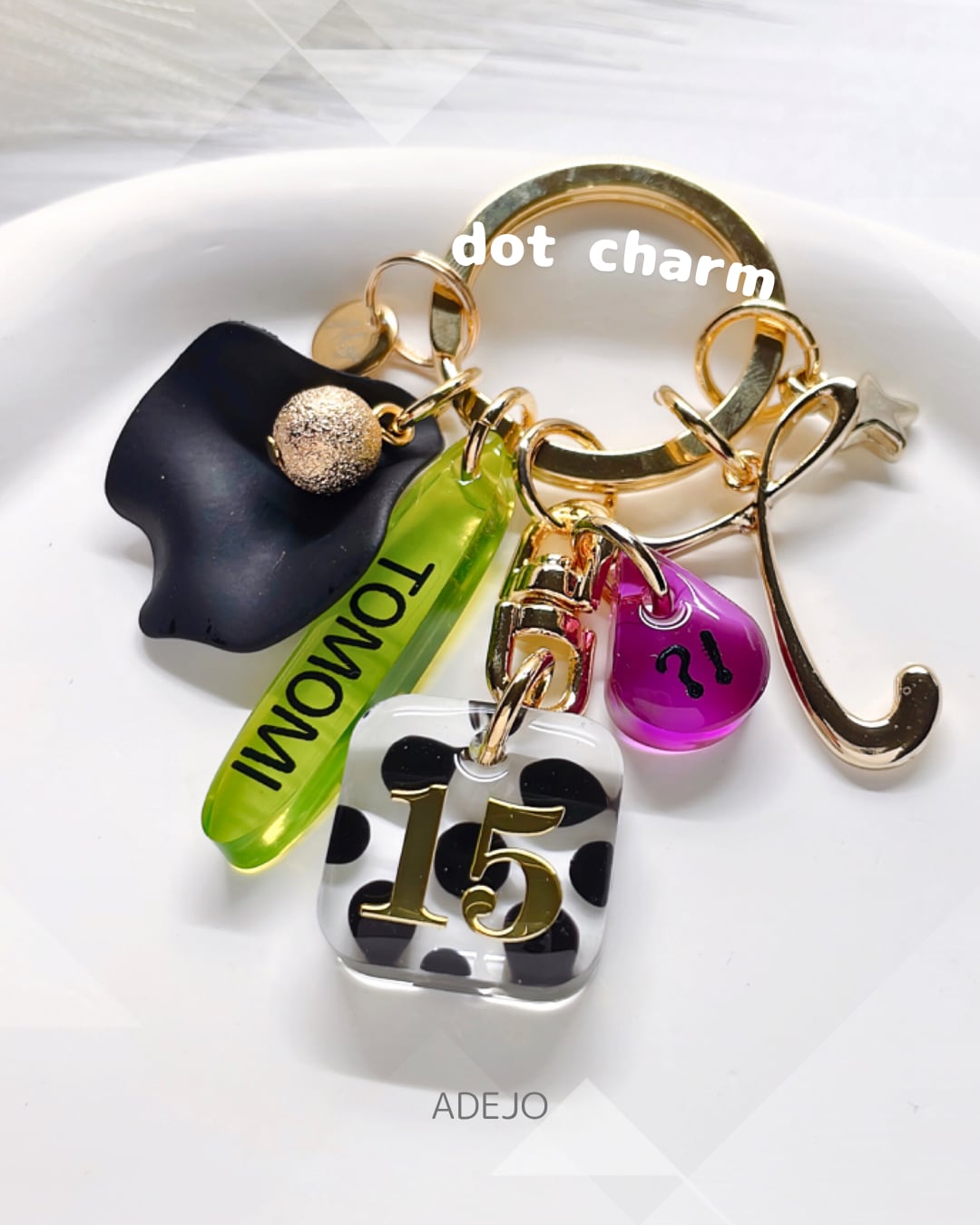 カラフルでポップなデザインが目を引く、遊び心満載のキーホルダーです。ドット柄とボーダー柄から選べるので、お好みのカスタマイズで楽しめます。ネオンカラーが鮮やかなパーツがたくさんついているので、バッグやポーチなどのアクセントにぴったり!