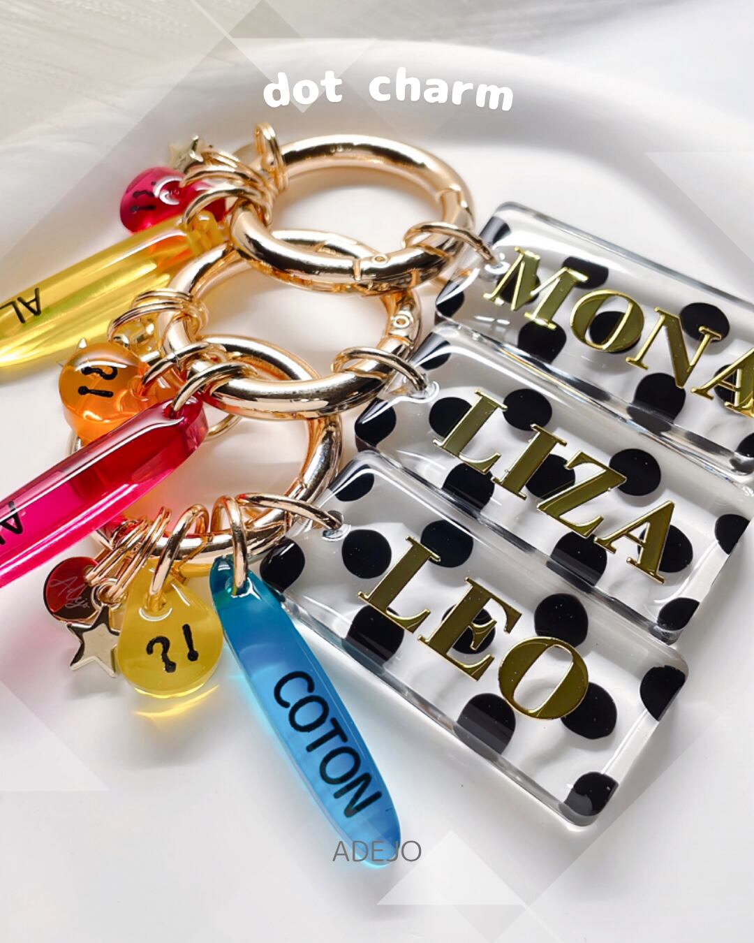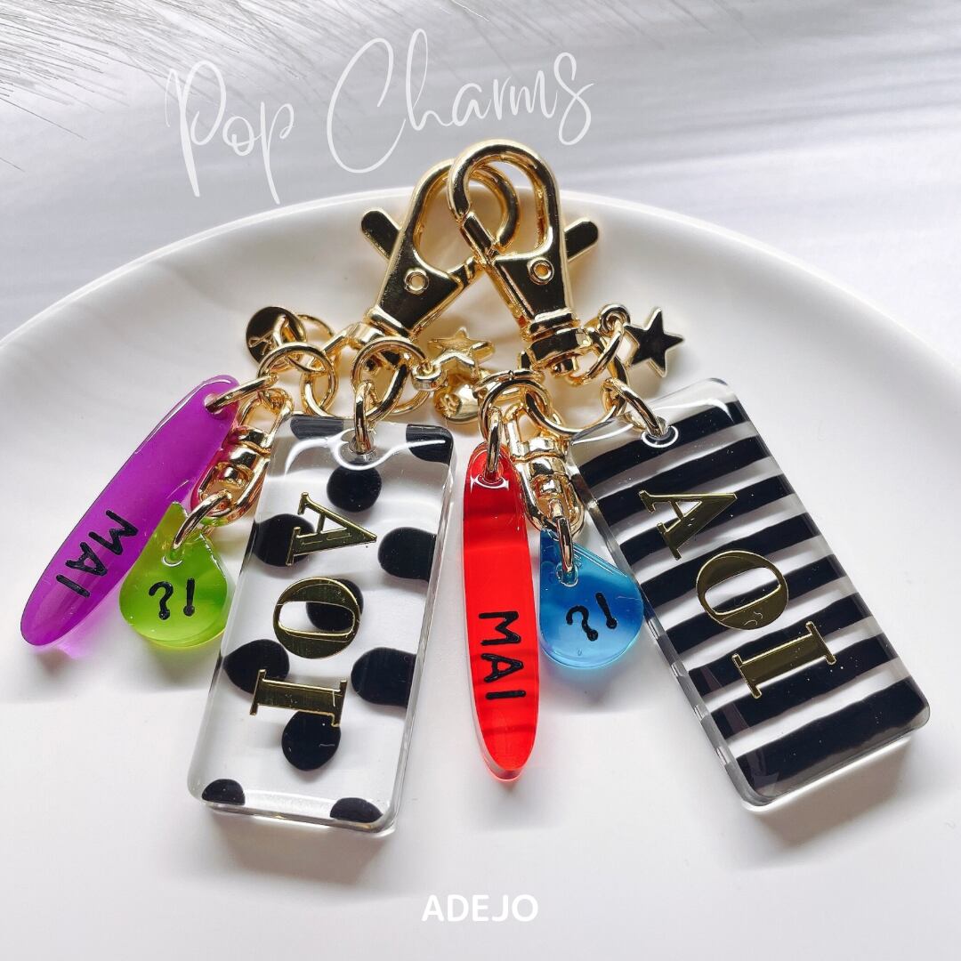 カラフルでポップなデザインが目を引く、遊び心満載のキーホルダーです。ドット柄とボーダー柄から選べるので、お好みのカスタマイズで楽しめます。ネオンカラーが鮮やかなパーツがたくさんついているので、バッグやポーチなどのアクセントにぴったり!